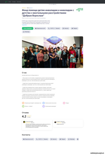 Промо-сайт благотворительного фонда «Добрые Взрослые» для помощи детям-инвалидам и взрослым с ментальными нарушениями. Создан на базе сервиса «Яндекс.Бизнес», адаптивен и оптимизирован для SEO и мобильных устройств. Содержит основную информацию, ссылки на сайт фонда и соцсети, контактные данные. |